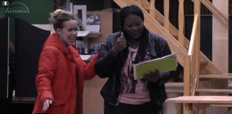 Enthousiast opent Gabriëlle haar post. Ze heeft post van Brut, haar moeder. Gabriëlle vraagt de Laura’s: “wil je het horen?”, “als jij het wilt voorlezen” zegt Laura. Gabriëlle leest de brief van haar moeder Brut voor. Die bedankt Gabriëlle voor haar post. De verdere inhoud van de brief is dat Gabriëlle’s moeder” blij is met de kalender met hen allemaal erop. Leuk die lieve woordjes van Marc en Laura, ik moest erg lachen. Ik ben trots op je, trots dat je zoveel gewicht kwijt bent. Langzaam aan ga je naar dat mooie lijf. Don’t fuck up”. De moeder van Gabriëlle geeft verder nog aan blij te zijn dat ze voor Tineke hebben gekozen, want een beetje orde en netheid was dringend nodig. De moeder beseft ook dat Gabriëlle dagen bezig is geweest met het Magazine. Dat ze nu wat meer tijd over heeft en die tijd maar moet besteden om wat meer te sporten en ook wat te helpen bij de anderen, zodat ze haar steentje bij draagt binnen Utopia. Team work ontbreekt nog af en toe, ondanks dat jullie allemaal jullie best doen. Ze geeft aan Gabriëlle aan dat niet als negatieve kritiek te zien, maar als opbouwende kritiek. Ook vertelt ze haar dochter in de brief, dat ze nu Utopia op de voet volgt. Verder blijkt nog uit de brief dat de lieve vriendin van Gabriëlle haar moeder heeft geholpen met het in elkaar zetten van de eetkamer stoelen. Haar moeder geeft aan dat naar neef “boos” is dat ze hem niet vernoemt binnen Utopia. Tyran de voetballende neef van Gabriëlle die volgens Gabriëlle 14 jaar is, maar wel 18 jaar oud lijkt te zijn. Wij zien trouwens in dit filmpje, een hele gezellige huiselijke sfeer. Gabriëlle zit in vuur en vlam de brief van haar moeder voor te lezen, terwijl de beide Laura’s de was aan het vouwen zijn. Wij willen jullie dit beeld niet onthouden en voegen een foto toe van dit lieflijke tafereeltje.